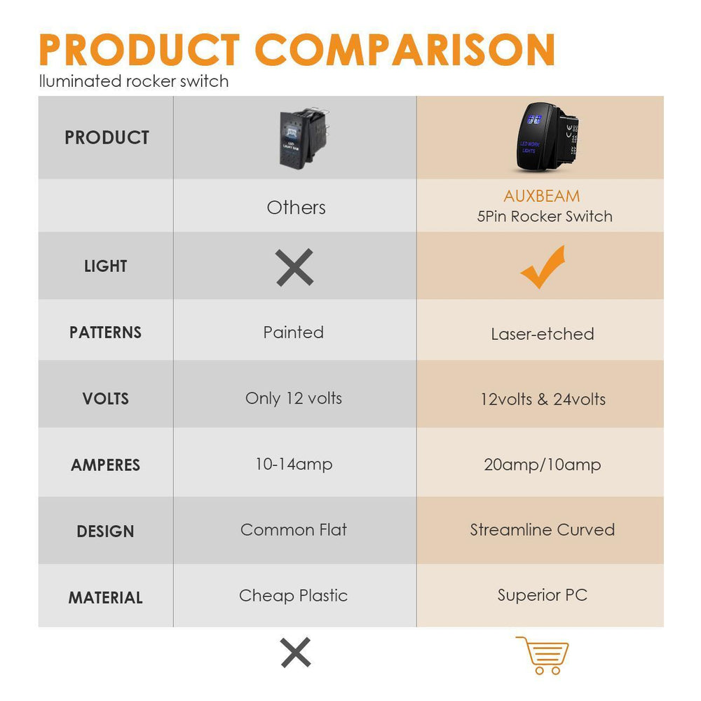 WIDE APPLICATION: standard 5 Pin switch, rated at 20amp/12v and 10amp/24v, available for upgrading most wiring harness to control Led Light Bar, Led Work Lights, Fog Lamps, light, Taillights, and Auxiliary Lamps, etc