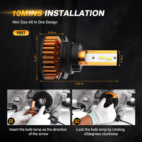 9007 LED Headlight Bulbs 52W 10000LM F2 Series Mini Size 6500K Cool White | 2 Bulbs