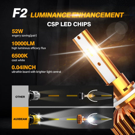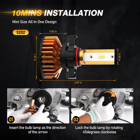 5202 LED Headlight Bulbs 52W 10000LM F2 Series Mini Size 6500K Cool White | 2 Bulbs