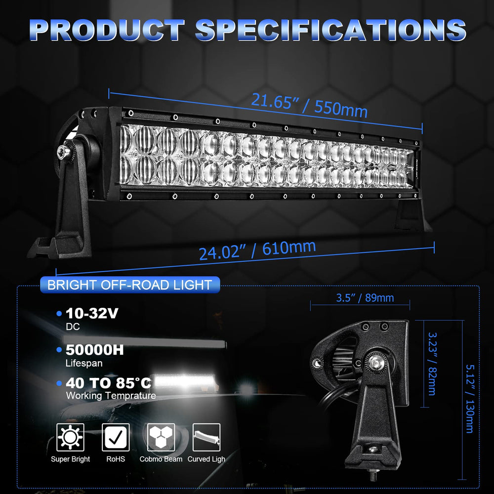 Perfect Performance: Auxbeam 22 inch curved LED light bar is made of 40pcs*3W intense LED chips. With the 12000LM 6500K cool white light, night vision will be clearer and wider. Innovative 5D optical design (fisheye lens + reflector), project light to extremely long distances in the dark, and maintain bright surround lighting at close distances.