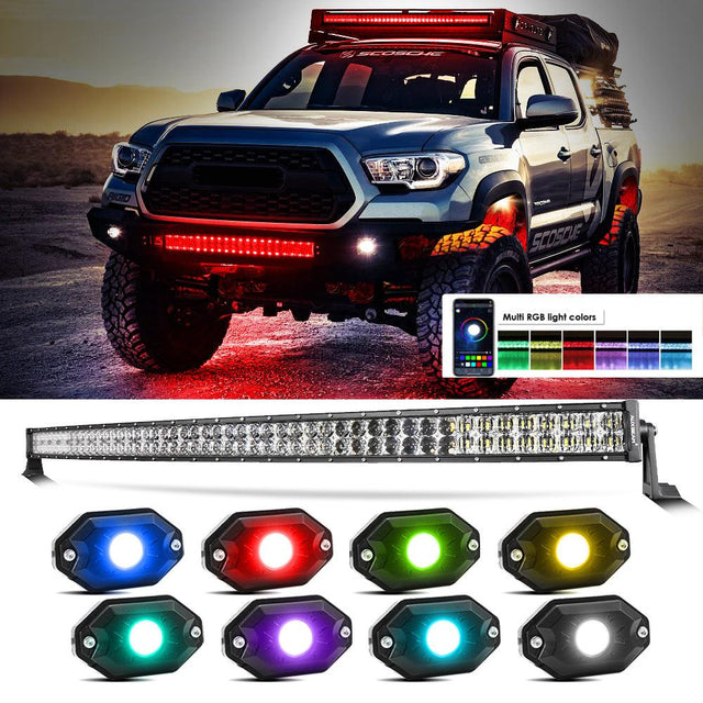 New 52 Inch V-PRO Series Curved RGBW Color Changing Off Road Led Light Bar & RGB LED Rock Light Set Combo