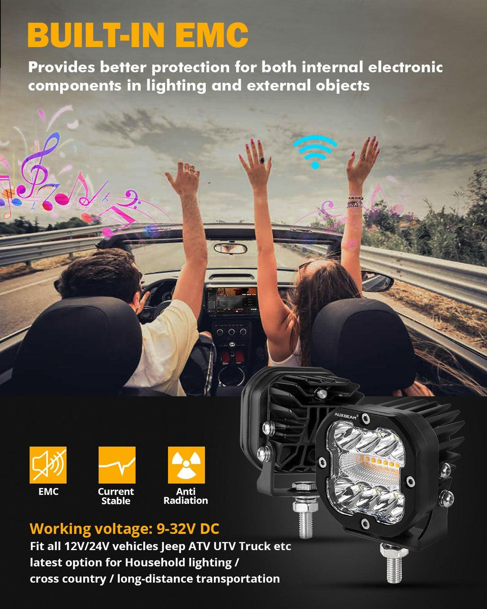 • With upgraded 3535 LED chips, the white light spot beam provides you with a brighter and more concentrated field. The exclusive design reflector cup of the amber light offers wider illumination range.