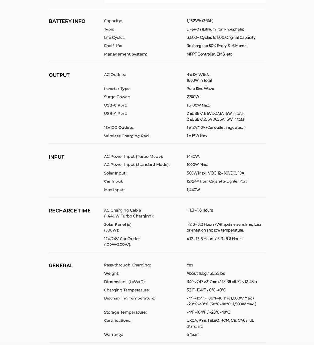 | Max AC Input | 1,440W (Turbo Charging) | Achieves 0-80% recharge in 45 minutes. |